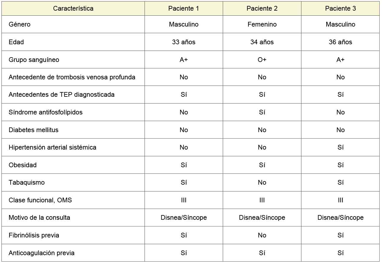 La presentación usual de la patología ocurre en la década de los 50 a 60 años de edad,7,25,27 los pacientes tratados fueron adultos jóvenes. Dos de ellos con grupo sanguíneo A+ y uno de ellos con O+, pero con síndrome antifosfolípido como factor de riesgo para trombosis. Los tres en clase funcional III/IV de la OMS, obesos, con disnea y síncope como presentación de la enfermedad y con el antecedente de haber tenido TEP aguda. En otra unidad, a dos de ellos se les dio como tratamiento fibrinólisis, resultando fallida, los tres recibieron tratamiento anticoagulante oral posterior a su evento. Uno de ellos tenía comorbilidades diversas. El comportamiento hemodinámico y de la clase funcional posterior a la TEnd pulmonar fue a la reducción de la presión pulmonar y a cambio en su clase funcional a I/IV (vercuadro II).