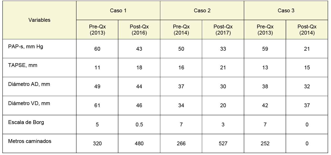 Methods: From December 2013 to June 2014 a serie of consecutive cases was studied according to the guidelines of the Fifth World Symposium of Pulmonary Hypertension. Its antecedents, clinical characteristics, functional class, hemodynamics, exercise capacity were defined in pre and post-operative conditions.