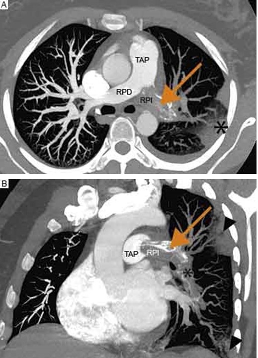 A. Imagen en máxima intensidad del pixel de un corte transversal en donde la flecha señala un defecto de llenado sub-oclusivo en la rama pulmonar izquierda. El asterisco señala una zona de infarto pulmonar homolateral.