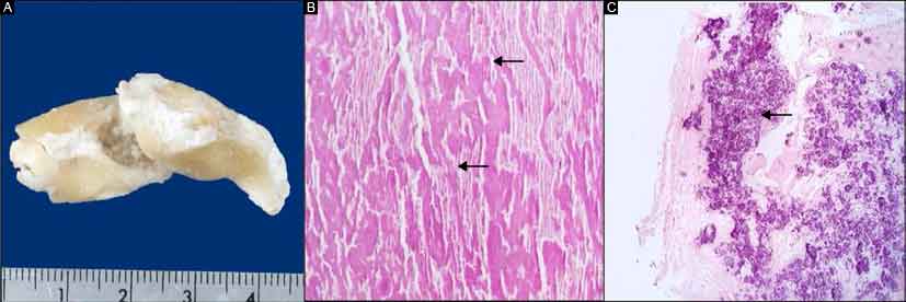 C. Calcificaciones distróficas basófilas granulares en el trombo (flechas verdes) en tinción de hematoxilina-eosina a 10x