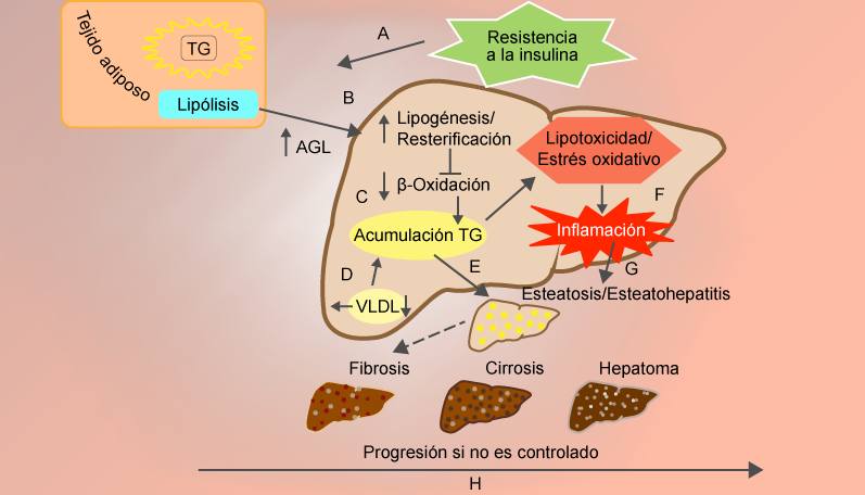 A) Por la resistencia a la insulina se reduce el efecto antilipolítico de la insulina e incrementa la lipólisis. B) El incremento en la lipólisis aumenta el flujo de ácido grasos libres (AGL) hacia el hígado. C) La mayor cantidad de ácidos grasos incrementa la lipogénesis y la resterificación, reduciéndose al mismo tiempo la oxidación de los ácidos grasos y ocasionando una acumulación de triglicéridos (TG). D) Existe una reducción en la exportación de triglicéridos, lo que contribuye a la acumulación de TG. E) La acumulación excesiva de triglicéridos por arriba del 5% del peso total del hígado origina la esteatosis hepática no alcohólica. F) La acumulación excesiva de TG provoca un lipotoxicidad y un estrés oxidaivo. G) La inflamación crónica desencadena la esteatohepatitis. H) Si la esteatohepatitis no es controlada adecuadamente, puede progresar a fibrosis, cirrosis y cáncer hepático