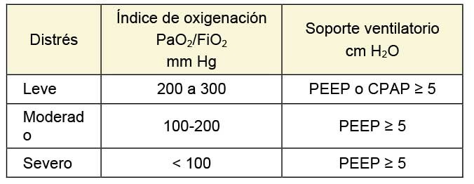 Hg = Mercurio; PaO2 = Presión parcial arterial de oxígeno; FIO2 = Fracción inspirada de oxígeno; H2O = Agua; PEEP = Positive End Expiratory Pressure; CPAP = Continuous Positive Airway Pressure