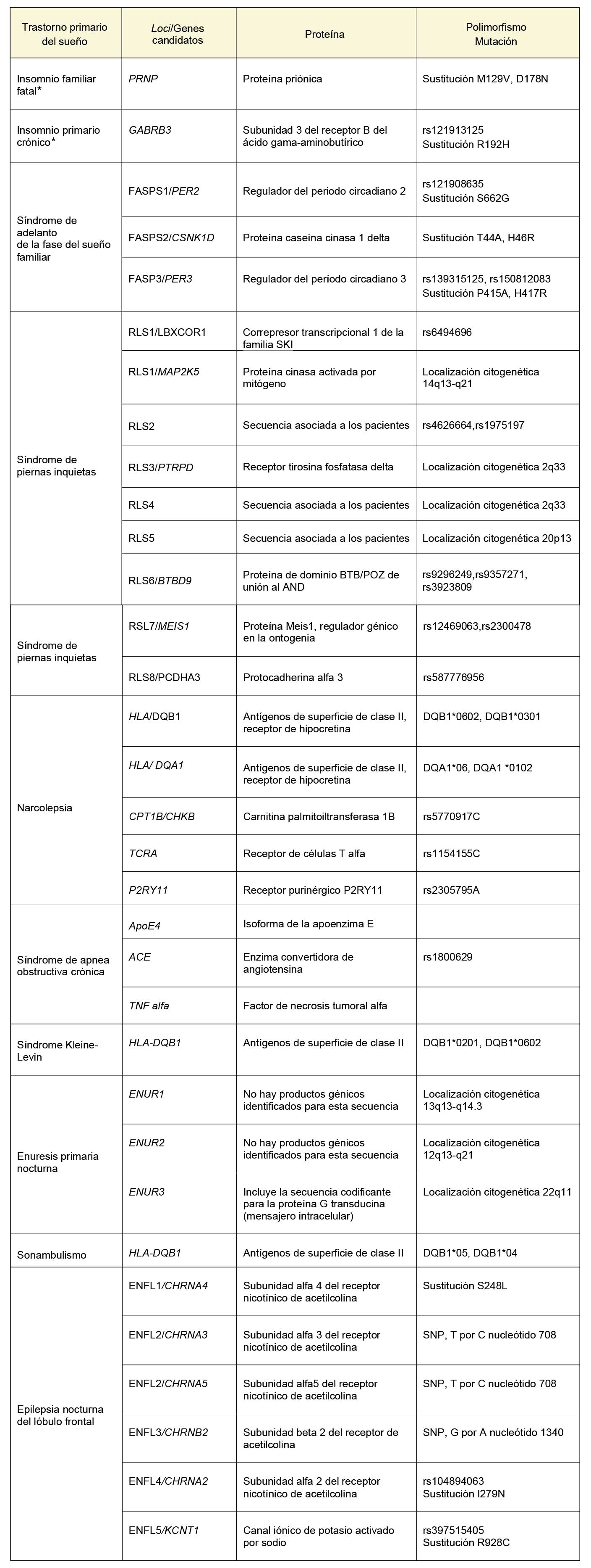 Los trastornos primarios del sueño son entidades complejas, en las cuales el fenotipo está dado por múltiples genes y su interacción con factores ambientales. En la actualidad existen más de 100 trastornos del sueño y en algunos de ellos se encuentra un componente familiar o genético. La contribución de los factores genéticos en la patología de los trastornos del sueño se está incrementando de manera importante.