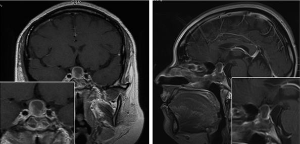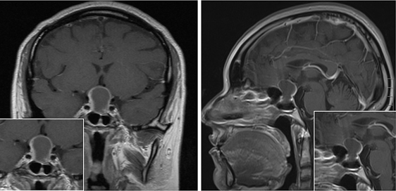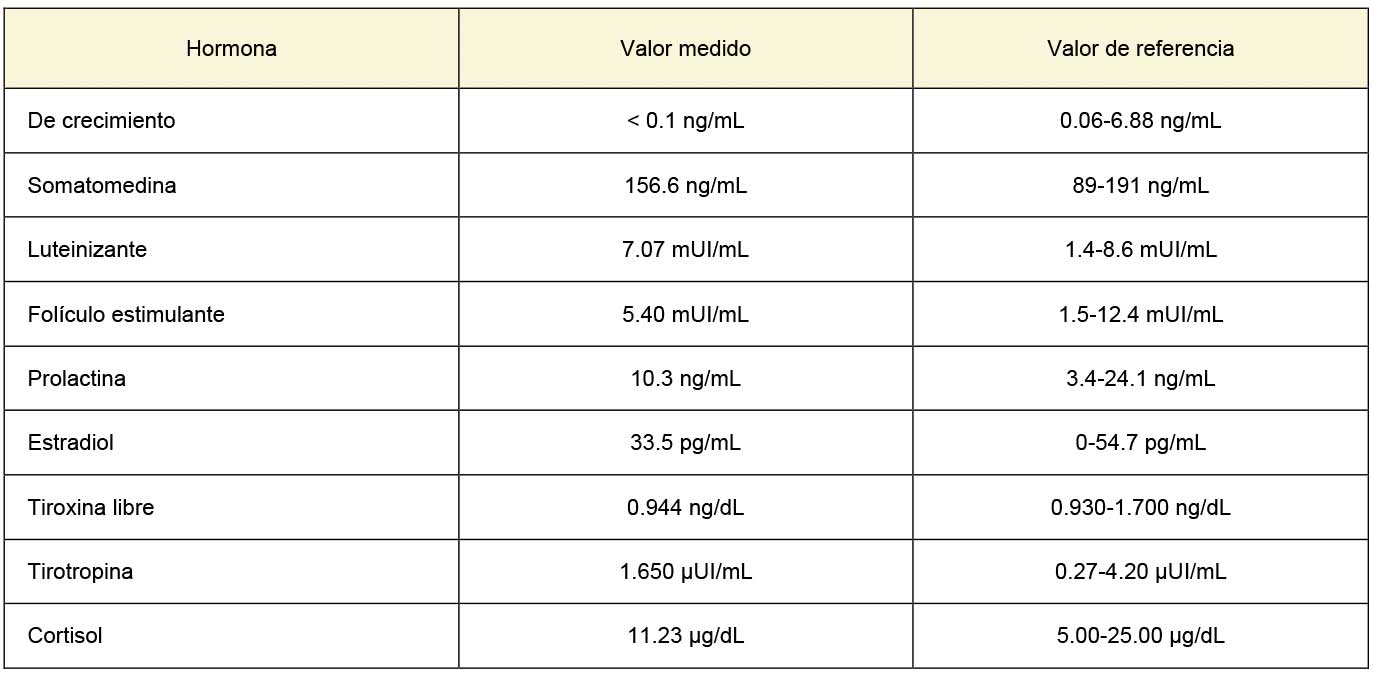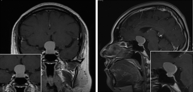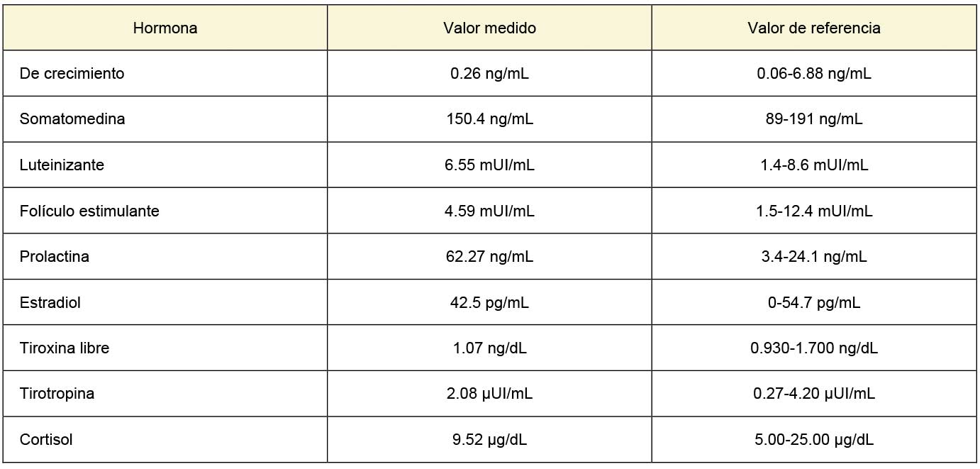Mujer de 25 años de edad, sin antecedentes médicos de importancia. Su padecimiento se manifestó 12 meses antes de su ingreso al hospital, con oligomenorrea, aumento de peso (aproximadamente 10 kg en siete meses) y fatiga crónica. Refirió que tres meses antes de su ingresó tuvo disminución de la agudeza y del campo visuales; en la campimetría computada del ojo izquierdo se evidenció la presencia de hemianopsia bitemporal, motivo por el cual se indicó el estudio de hipófisis mediante resonancia magnética nuclear (RMN).