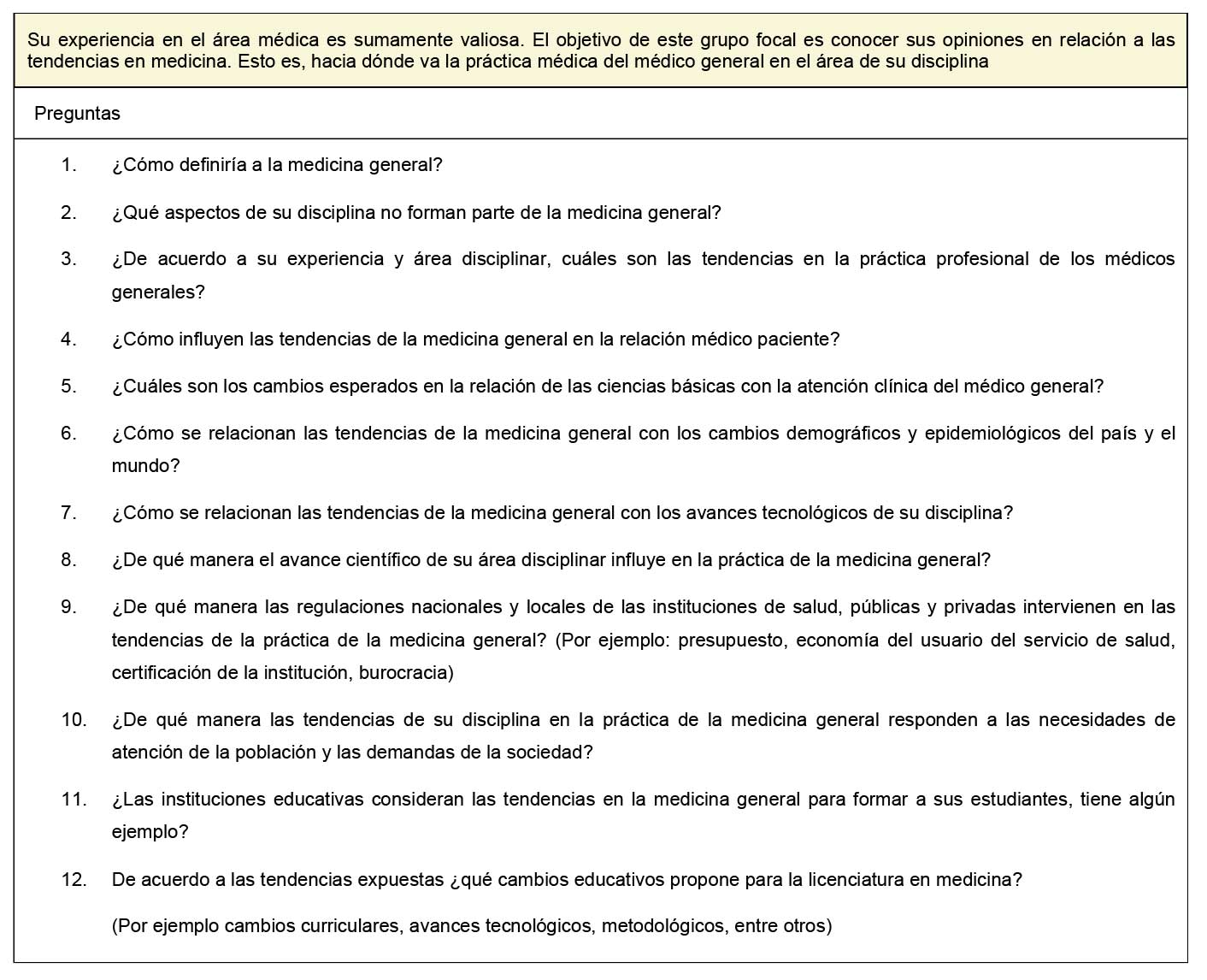 Segunda fase. Se indagó la opinión de expertos en la enseñanza de las ciencias básicas, clínicas y de médicos recién egresados del servicio social sobre las tendencias en la medicina general. Con base en la información obtenida de la primera fase, un grupo de interdisciplinario de especialistas en educación médica elaboró tres guías de entrevista (anexo 1) para realizar grupos focales en los siguientes tres estamentos: 1) docentes del área clínica, 2) docentes del área básica y 3) médicos recién egresados del servicio social; a fin de escuchar a los docentes de la institución con características distintivas (áreas clínica, sociomédica y biomédica, con sus diversas experiencias dentro del aula y en los escenarios clínicos); así como la visión de los médicos generales recién egresados, quienes tenían la vivencia cercana de valorar la pertinencia del Plan de Estudios 2010 con respecto a las necesidades del médico general.