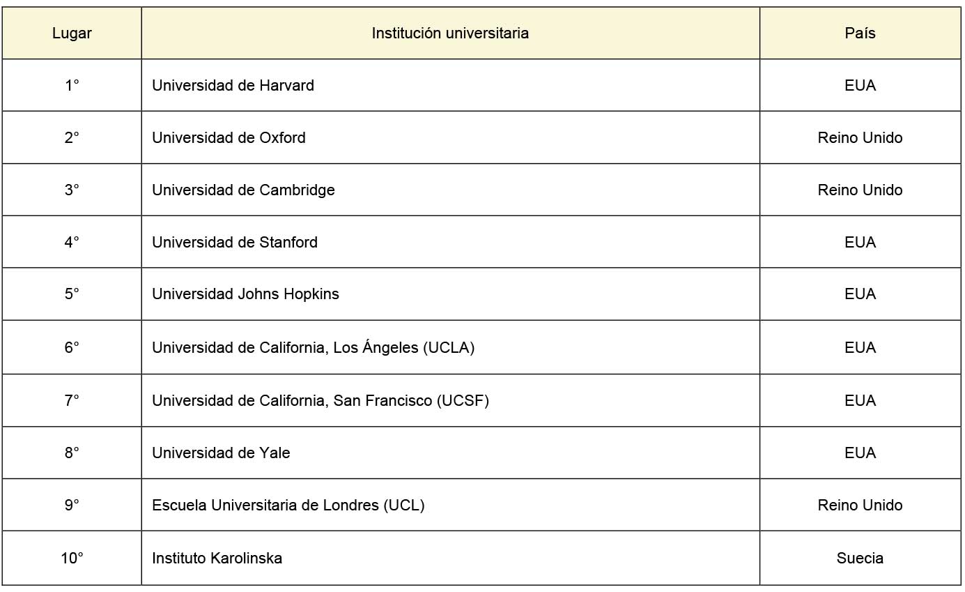 Con base en la clasificación publicada por Quacquarelli Symonds, QS World University Rankings 2016, para escuelas y facultades de medicina,4 la cual analiza 42 puntos basados en la reputación académica (es decir, a la selección que realizan académicos expertos de las instituciones universitarias de excelencia) y de empleo (selección que realizan los egresados sobre dónde desean ser empleados), así como el impacto en la investigación y en las publicaciones, se seleccionaron las primeras diez universidades para comparar sus planes de estudios con el Plan de Estudios 2010 (cuadro I). Los rubros a equiparar fueron los aspectos sobresalientes o innovadores del currículo y de la vinculación con otros sectores académicos, empresariales y de investigación.