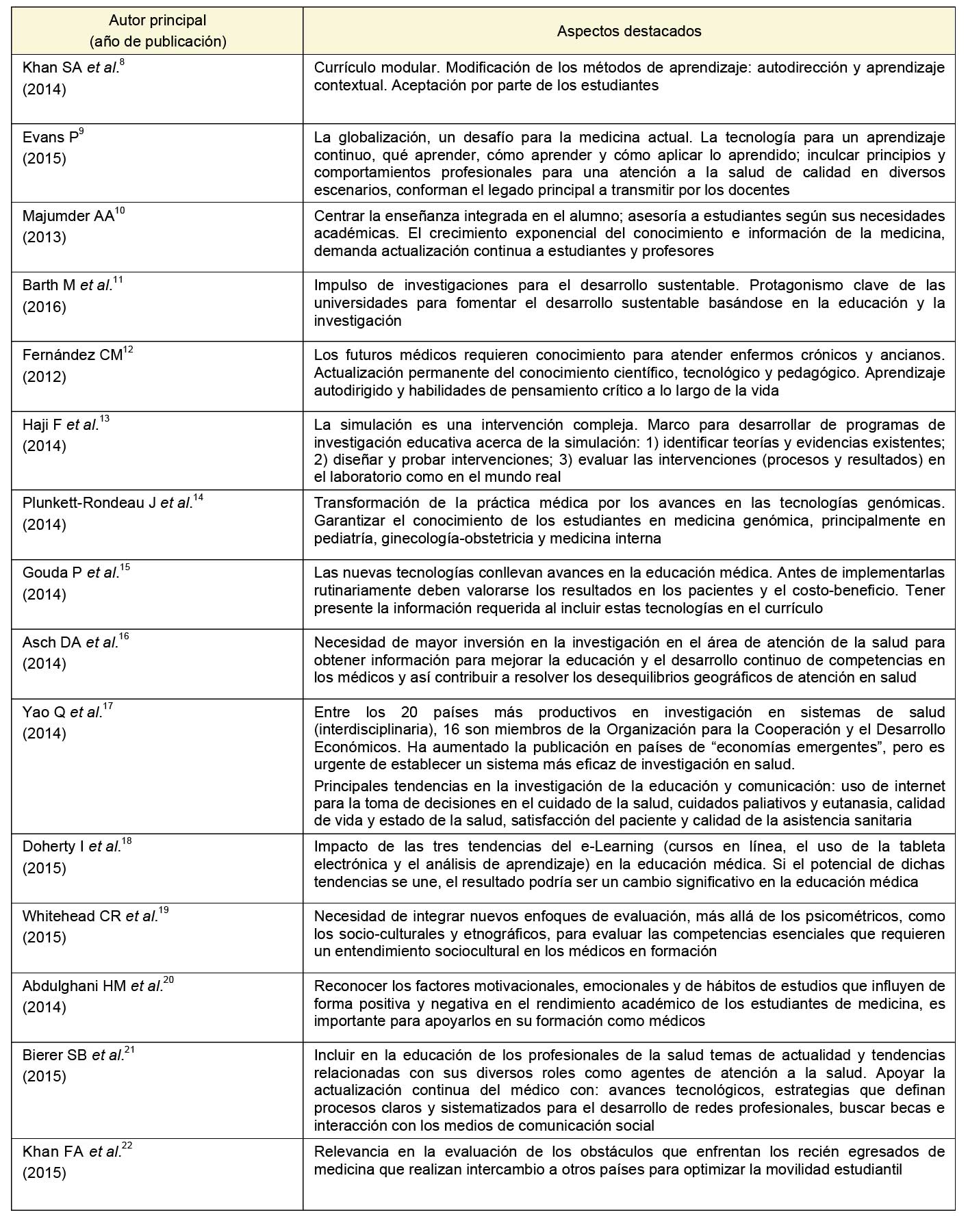 En cuanto a las ciencias biomédicas (áreas emergentes y nuevas disciplinas), se identificó la preocupación por incorporar en las facultades de medicina nuevos avances con enfoque clínico, como las tecnologías genómicas que están transformando la práctica médica en países de primer mundo, y garantizar este conocimiento en los países en vías de desarrollo para reducir el número de “médicos genómicamente analfabetos”.14 También se halló el fomento de la investigación en medicina molecular. Se observó una inclusión de asignaturas sobre oncología por la prevalencia de dicha enfermedad en la población.