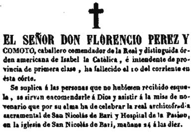 Figura 1 Esquela funeraria de don Florencio Pérez y Comoto