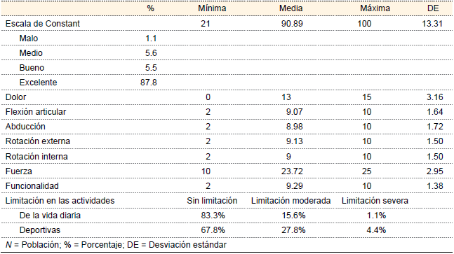 Referente a los resultados funcionales evaluados por la Escala de Constant-Murley a los 6 meses de operados los pacientes, la puntuación correspondió a resultados malos en 1.1%, resultados medios en 5.6%, buenos en 5.5% y excelentes en 87.8% de los pacientes. Los detalles de los resultados de la Escala de Constant-Murley por dominio se muestran en el cuadro I.