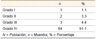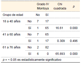 La asociación entre edad por grupos con el grado IV de la Escala de Montoya fue estadísticamente significativa para el grupo de edad de 18 a 40 años y de 61 a 76 años (p = 0.000) (cuadro IV).