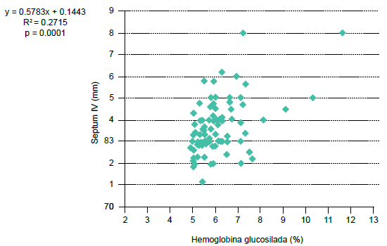 Del total, 12 pacientes (11.53%) mostraron grosor de del septum interventricular igual o mayor a 5 mm, 7 (33%) eran del grupo de HbA1c mayor o igual a 6.5% (p = 0.002, 7.8, 2.2-28.1) (cuadro II).