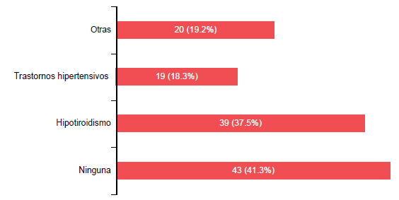 A pesar que no hubo diferencia estadística respecto a la frecuencia de patologías asociadas entre los grupos, cabe mencionar que el 59% de los casos refieren al menos una comorbilidad (61) dentro de las que prevalecen: el hipotiroidismo con 39 casos (37.5%), seguido de algún trastorno hipertensivo 19 (18.3%), y otros 20 (19.2%) como se muestra en la figura 2.