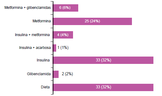 Respecto al tipo de diabetes, observamos que del total, 69 pacientes (66%) presentaron DMG.