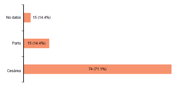 En lo referente a la vía de nacimiento, a un 71% (74 pacientes) se les realizo cesárea, 14% (15) tuvieron parto vaginal y del resto no existen datos, ya que tuvieron finalización de la gestación en un hospital de segundo nivel (figura 8).