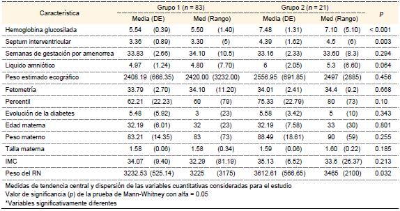 Para las variables cuantitativas (HbA1c, septum ventricular, semanas de gestación por amenorrea, líquido amniótico, peso estimado ecográfico, fetometría, percentil, evolución de la diabetes, edad materna, peso materno, talla materna, IMC y peso del RN) se calculó la media, desviación estándar y mediana con el rango de los datos para cada uno de los dos grupos de mujeres. Posteriormente, se realizaron pruebas U de Mann-Whitney para determinar diferencia significativa entre los grupos de mujeres para cada variable (alfa < 0.05). Para las variables de patologías asociadas, tratamiento, escolaridad, estado civil, ocupación, destino del recién nacido y vía de desembarazo se obtuvo la frecuencia y porcentaje de cada uno de sus niveles, y se representaron en gráficas de barras. Todos los análisis estadísticos fueron desarrollados en el programa computacional SPSS versión 18.