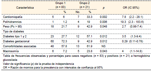 Results: 104 diabetic pregnant patients were included in the study, 83 patients in the group with normal glycated hemoglobin and 21 in the group with altered glycated hemoglobin. Of the 104 patients, 12 had fetal hypertrophic cardiomyopathy; 5 of the group with normal glycated hemoglobin and 7 with altered glycated hemoglobin. There is a clear association previously reported between the level maternal metabolic control and the presence of fetal and neonatal complications.