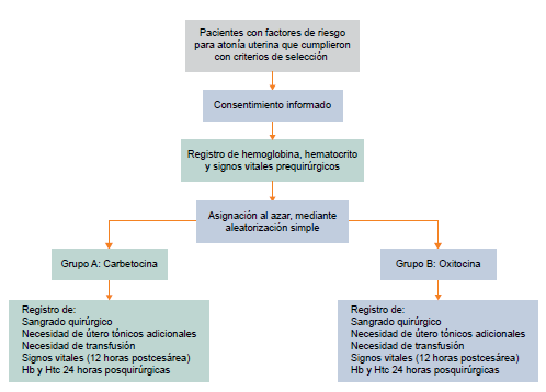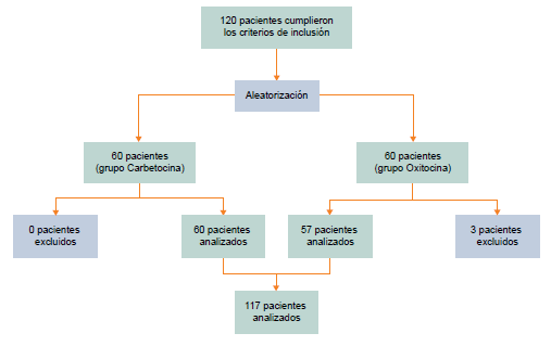 Criterios de no inclusión: pacientes que no aceptaron participar en el estudio; alergia conocida a oxitocina o carbetocina; coagulopatía conocida previa.