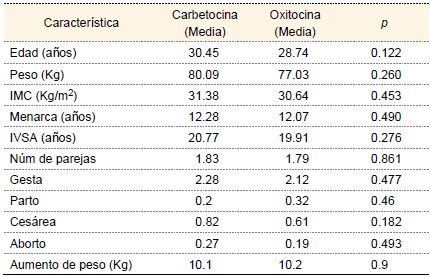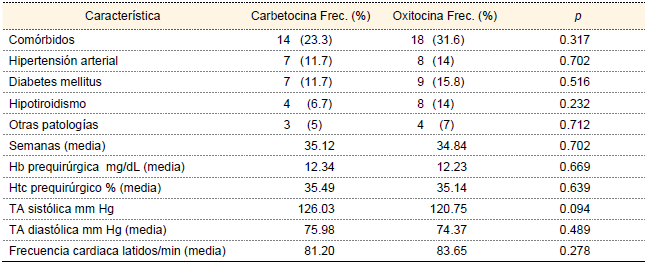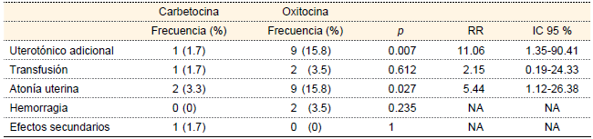 Resultados: se estudiaron un total de120 pacientes en 6 meses, se excluyeron 3, de las cuales 60 fueron tratadas con carbetocina y 57 con oxitocina. Se determinó que existe un mayor número de eventos de atonía uterina (p = 0.007, con RR de 11.06) y, por ende, mayor necesidad de uterotónico adicional (p = 0.027, con RR de 5.44), en el grupo de la oxitocina. No hubo diferencia estadísticamente significativa en el resto de las variables.