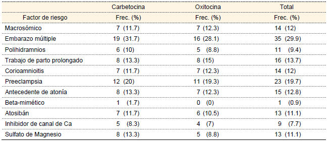 Mediante este estudio no es posible hacer aseveraciones con respecto a la utilización de oxitocina o carbetocina con algún factor de riesgo específico, debido a que el número de pacientes incluido en los diferentes grupos fue pequeño, no contando con el suficiente poder estadístico para tomar decisiones. El factor de riesgo que mayor número de pacientes concentró, fue el embarazo múltiple, con 35 pacientes, que después de su análisis individual, no se encontró diferencia significativa en ninguna de las variables. Lo mismo sucedió con el resto de los factores de riesgo.