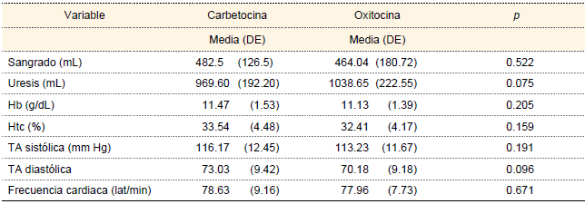 No existió diferencia entre los grupos al comparar el sangrado quirúrgico, la uresis durante las primeras 12 horas, los signos vitales 12 horas posteriores a la cesárea, la hemoglobina y el hematocrito 24 horas después de la cirugía. De todos los resultados secundarios evaluados, los únicos que presentaron diferencia estadísticamente significativa, fueron: la necesidad de uterotónico adicional y la presencia de atonía uterina.