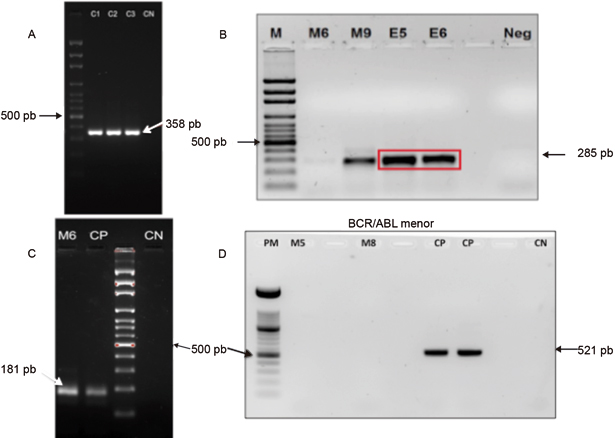 A) Productos de PCR para MLL-AF4 de 385 pb, C1, C2 y C3 son controles positivos de la línea celular RS4. CN, control negativo. B) Productos de PCR para E2A-PBX1. M6: Muestra de pacientes negativa, M9: Muestra de paciente Positiva. E5 y E6: Controles Positivos. Neg: Control Negativo. C) Productos de PCR para TEL-AML1. CP: Control Positivo. CN: Control Negativo. M6: Muestra de Paciente Positiva. D) Productos de PCR para BCR-ABL menor. CP: Control Positivo. CN: Control Negativo. M5 y M8: Muestras de Pacientes negativas. PM: Marcador de peso molecular. Los geles de agarosa al 2% y teñidos con bromuro de etidio. Marcador de pares de bases de 100 pb