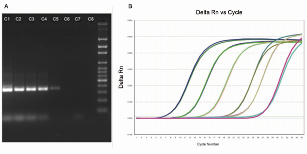 La PCR en tiempo real tiene la ventaja de ser una prueba más sensible respecto a la PCR en punto final, como se demostró comparando las diluciones más bajas mediante un gel de agarosa contra la detección de la fluorescencia en la PCR de tiempo real (figura 3). Por lo que el límite inferior de detección en este ensayo fue mayor a 1000 copias.