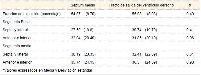 Al analizar la diferencia de la activación entre las paredes septal y lateral, así como anterior e inferior en su segmento basal y medio del ventrículo izquierdo, no se demostró una diferencia estadísticamente significativa al realizar la comparación de medias con la prueba t de Student para grupos independientes (cuadro II).