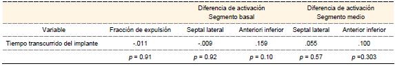 Se analizó por medio de correlación de Pearson el tiempo transcurrido desde la colocación del electrodo de estimulación ventricular, los valores de la fracción de expulsión y la diferencia de activación entre los segmentos analizados, no encontrando correlación entre estas variables (cuadro III).
