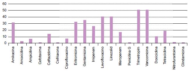 Como se muestra en la figura 1, los antibióticos con mejor sensibilidad de acuerdo al tipo de microorganismos fueron trimetoprim-sulfametoxazol y vancomicina (51.74%), levofloxacino y linezolid (41.25%), gentamicina (51%), eritromicina (48%) y amikacina (46%).