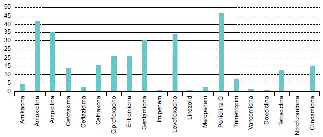 En la figura 2 podemos observar la resistencia antibiótica, los reportados con mayor porcentaje fueron la penicilina G (67%), amoxicilina con ácido clavulánico (60%) y ampicilina (51%).