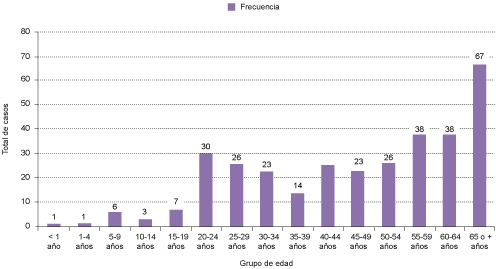 El grupo de edad más afectado fue el grupo de 65 años o más con un 20.4% (67 casos de tuberculosis), seguido de los grupos de edad de 55 a 59 y 60 a 64 años, ambos con 11.6% (38 casos cada uno); asimismo, el grupo menos afectado fue el de menores de cinco años, como se muestra en la figura 1.