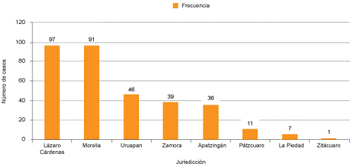 De acuerdo con la localización geográfica de los casos, el 29.6% (97 casos) fueron identificados en la jurisdicción sanitaria 08, de Lázaro Cárdenas; el 27.7% (91 casos) por la jurisdicción 01, de Morelia; la jurisdicción con el menor número de casos identificados fue la jurisdicción 03, de Zitácuaro, como se observa en la figura 2.