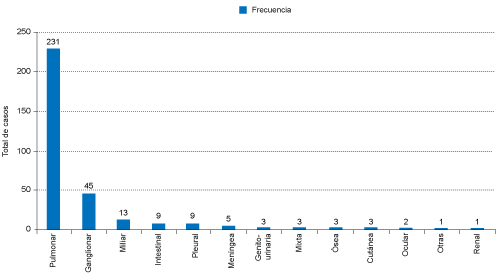 De acuerdo con la localización de la tuberculosis, 70.4% era pulmonar con 231 casos, seguida por el 13.7% de tuberculosis ganglionar con 45 casos, 4% de tuberculosis miliar con 13 casos; el restante 11.9% fueron casos de tuberculosis genitourinaria, intestinal, meníngea, mixta, ocular, cutánea, ósea, pleural y renal. De acuerdo con el método utilizado para realizar el diagnóstico de tuberculosis, 67.4% se hizo por baciloscopía seriada, el 20.4% por histopatología (40 casos de tuberculosis ganglionar, tres casos de tuberculosis genitourinaria, ocho casos de tuberculosis intestinal, un caso de tuberculosis miliar, un caso de tuberculosis mixta, dos casos de tuberculosis ósea, dos casos de tuberculosis cutánea, seis casos de tuberculosis pleural y finalmente cuatro casos con tuberculosis diagnosticadas con resultado de biopsia), el 4.6% con otros métodos como la reacción en cadena de la polimerasa (PCR, por sus siglas en inglés) y la prueba cutánea de derivado proteico purificado (PPD, por sus siglas en inglés), el 3.7% por una asociación clínica, epidemiológica y radiológica, 2.4% solo con interpretación radiológica y 1.5% por cultivo. El 61.9% de los casos se curó, el 25.9% terminó el tratamiento sin baciloscopía, el 3.35% abandonó el tratamiento, el 0.6% fracasó al tratamiento, el 2.16% murió por algún tipo de tuberculosis y, finalmente, el 6.09% murió por otra causa mientras recibía el tratamiento por tuberculosis. De las enfermedades asociadas a los casos de tuberculosis, 24.7% (81 casos) tenían diabetes mellitus tipo 2, el 6.4% estaban desnutridos, el 52.4% no tenía ninguna patología agregada y el resto tenía otra patología.