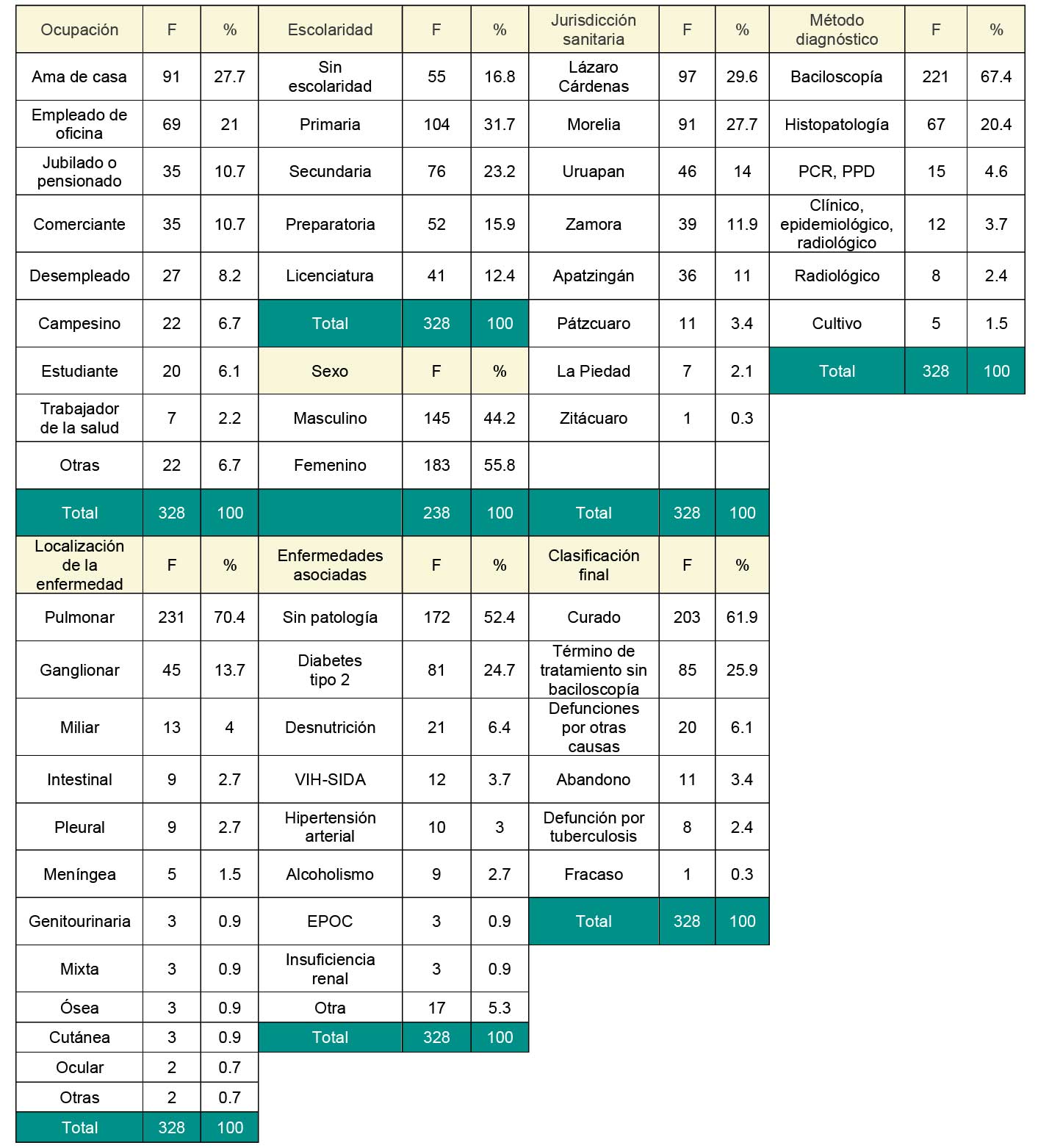 Se encontraron 341 registros en la base de datos notificados en el SINAVE en toda la Delegación Michoacán y de estos solo 328 casos cumplieron con los criterios de inclusión para este estudio durante el periodo de 2015 a 2018 (84 casos en 2015, 79 en 2016, 98 en 2017, 67 en 2018). Del total de casos el 55.8% (183) fueron del sexo masculino y 44.2% (145 casos) del sexo femenino. La edad promedio de los casos fue de 48 años, la mediana de 50, la moda de 26, con desviación típica de 19 años; por grupo de edad, el 20.4% (67 casos) fueron de 65 años o más, el 11.6% (38 casos) de 60 a 64 años, al igual que el grupo de 55 a 59 años. En cuanto a la ocupación de los pacientes estudiados, 27.7% (91 casos) eran amas de casa, el 21% (69 casos) empleados de oficina, el 10.7% (35 casos) pacientes jubilados o pensionados, otro 10.7% (35 casos) comerciantes y el 29.8% restante llevaban a cabo otras ocupaciones. En cuanto a la escolaridad, el 31.7% (104 casos) tenía primaria, 23.2% secundaria, 16.8% no tenía estudios, 15.9% (52 casos) tenía preparatoria y finalmente el 12.4% tenía licenciatura. En relación con los casos de tuberculosis notificados por las ocho jurisdicciones sanitarias en las que se divide el estado, 29.6% de los casos (97) fueron de la jurisdicción sanitaria 08, de Lázaro Cárdenas; 27.7% (91 casos) pertenecieron a la jurisdicción sanitaria 01, de Morelia; la jurisdicción sanitaria de Uruapan tuvo el 14% (46 casos); la jurisdicción sanitaria de Zamora presentó 11.9% (39 casos); la jurisdicción 07, de Apatzingán, que tuvo 11% (36 casos); Pátzcuaro, que presentó el 3.4% (11 casos); la jurisdicción de La Piedad tuvo 2.1% (siete casos), y finalmente la jurisdicción de Zitácuaro, que tuvo 0.3% (un caso).