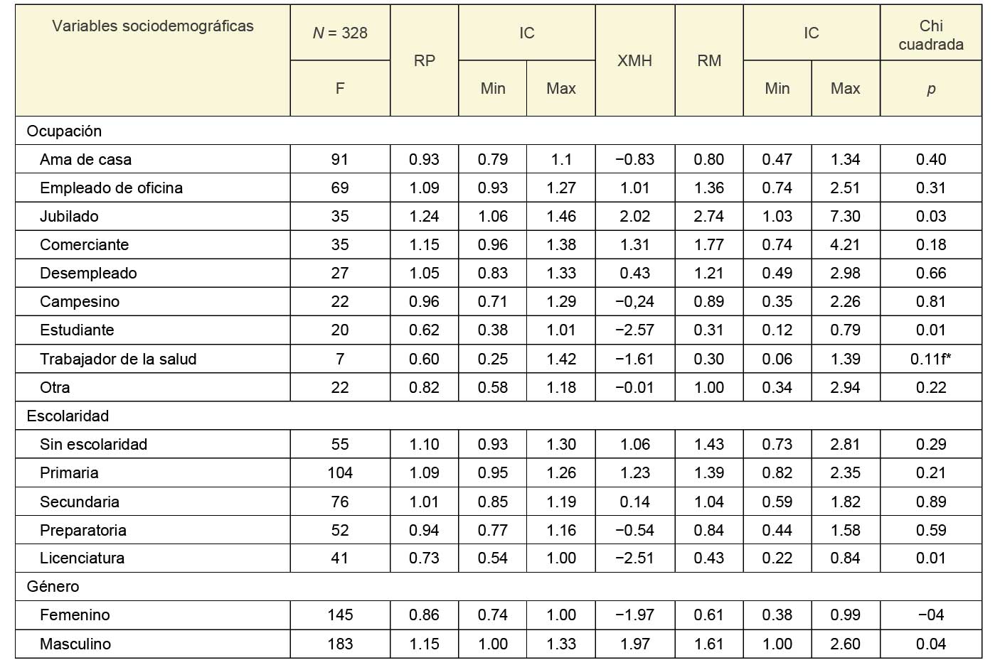 Del análisis que se realizó a los factores asociados a la tuberculosis pulmonar en la Delegación Michoacán durante el periodo 2015-2018, se encontró que de acuerdo con la ocupación del paciente la prevalencia de la tuberculosis pulmonar fue 1.24 veces mayor en los pacientes que eran jubilados o pensionados, en comparación con aquellos que tenían otra ocupación, con una XMH de 2.02, cuya RP fue significativa según la regla de decisión para esta prueba de hipótesis. De acuerdo con el resultado de la RM, los pacientes jubilados o pensionados tuvieron 2.74 veces el riesgo de presentar tuberculosis pulmonar en comparación con aquellos pacientes que tenían otra ocupación, con una chi cuadrada de p: 0.03 (IC 95%: 1.03‑7.30).