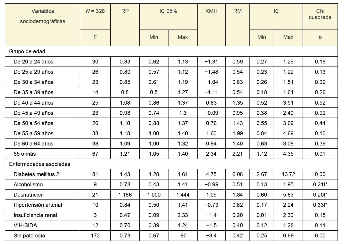 Por grupo de edad la prevalencia de tuberculosis pulmonar fue 1.21 veces mayor en el grupo de 65 años o más en comparación con los otros grupos de edad, con una XMH de 2.34, por lo que la RP para el grupo de 65 años o más fue significativa. Al calcular el riesgo con RM, el grupo de edad de 65 años o más tuvo 2.21 veces el riesgo de presentar tuberculosis pulmonar en comparación con los otros grupos de edad, con una chi cuadrada de p = 0.01 (IC 95%: 1.12‑4.35).