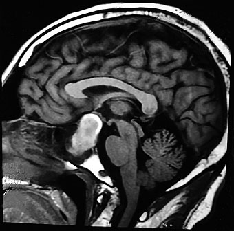 Finalmente acude al Instituto Nacional de Neurología y Neurocirugía en donde es valorado e ingresado. A la exploración física de ingreso se observó al paciente orientado en persona, lugar, no así en tiempo, con incapacidad para articular palabras, con borramiento de las líneas frontales y surco nasogeniano, ptosis palpebral izquierda, con ausencia de reflejo fotomotor y consensual ipsilateral, así como exotropía del globo ocular, comisura labial, lengua y úvula con desviación a la izquierda, resto de la exploración sin alteraciones. Se determinaron niveles hormonales que reportaron hipotiroidismo central e hipocortisolismo, instaurándose terapia de sustitución hormonal. A consecuencia de la dosis suprafisiológica de esteroides administrados, el paciente presentó psicosis inducida por esteroides, cuadro que remitió a las 24 horas posteriores. Finalmente, se realizó una resonancia de control en la cual se apreció la disminución del volumen tumoral en 1.5 cm, mientras que las nuevas determinaciones hormonales se encontraron dentro de los parámetros normales, así como la total remisión sindromática. Tres días después se decide su egreso y manejo ambulatorio por parte de los servicios de Endocrinología, Neurocirugía y Oftalmología.
