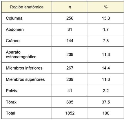 De acuerdo con la región anatómica para la que se solicitaron los estudios radiológicos (cuadro I), se observó una distribución en la que la mayor proporción fue para tórax (37.5%) y siguieron los miembros inferiores (14.4%), la columna (13.8%); asimismo, las regiones menos estudiadas fueron la pelvis (2.2%) y el abdomen (1.7%).