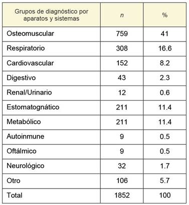 De acuerdo con la distribución de estudios solicitados por diagnóstico (agrupados por aparatos y sistemas) (cuadro II), se encontró que los diagnósticos de trastornos del sistema osteomuscular fueron los más demandados (41% del total), seguidos por los del respiratorio (16.6%), los odontológicos y del metabolismo (11% cada uno) y el cardiovascular (8.2%). Nuevamente, esta distribución parece obedecer a la utilidad de la radiología en su capacidad para mostrar alteraciones en los tejidos óseo y muscular, lo que define esta mayor utilización.
