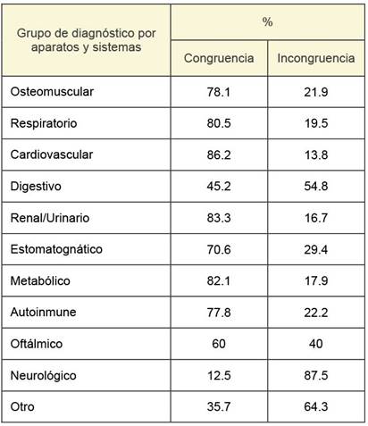 En el caso de la distribución de la congruencia por diagnósticos en relación con aparatos y sistemas, se encontró que fue menor en los diagnósticos vinculados a enfermedades neurológicas (87.5% de incongruencia), a diferencia de los diagnósticos sobre el sistema cardiovascular y renal/urinario, que mostraron la proporción más alta de congruencia (86.2% y 83.3%, respectivamente) (cuadro III).