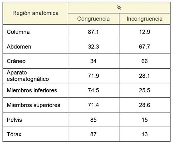 Fuente: elaboración propia con base en el registro de archivo clínico de la unidad de medicina familiar, IMSSAl analizar la congruencia por región anatómica, se encontró que fue mayor en estudios realizados sobre columna (87.1%), sobre tórax (87%) y pelvis (85%), mientras que la mayor incongruencia se observó en el abdomen (67%) y el cráneo (66%) (cuadro IV).