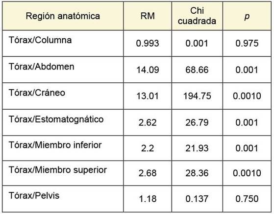 En cuanto a la región anatómica, los resultados se concentran en el cuadro V. Se observó una mayor probabilidad de congruencia en los estudios de tórax que con cualquier otra región, al comparar con cráneo, por ejemplo, se obtuvo una RM de 13.01 (p = 0.0010, chi cuadrada = 194.75), con miembros superiores una RM de 2.68 (p = 0.0010, chi cuadrada = 28.36), con miembros inferiores una RM de 2.2 (p = 0.001, chi cuadrada = 21.93) y odontológicas una RM de 2.62 (p = 0.001, chi cuadrada = 26.79), aunque estos resultados no mostraron significación estadística.