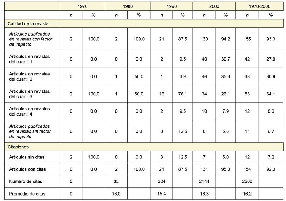 Por otra parte, 93.3% de los artículos de todo el periodo fueron publicados en revistas con factor de impacto y la mayoría en revistas del cuartil 2 y 3; sin embargo, al final del periodo se observa una práctica por publicar en fuentes de mayor calidad. La publicación en las primeras tres décadas fue en revistas del cuartil 3 y 4, es decir, en el rango inferior en cuanto a criterio de calidad de la revista; en cambio, 60% de los artículos de la década de 2000 aparecieron en revistas del cuartil 1 y 2, evaluadas como las de mayor influencia y calidad en su respectiva área. De los 11 artículos publicados en revistas sin factor de impacto, estas pertenecían al núcleo marginal de revistas, de las cuales nueve eran editadas en México y otras dos en países de América Latina (cuadro II).