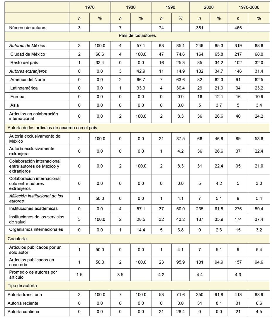 La comunidad científica de México estaba asentada en el centro del país, ya que 68% de los autores pertenecían a instituciones establecidas en la Ciudad de México; el tercio de autores residentes en el resto del país se incorporaron a la producción científica de este campo durante las décadas de 1990 y 2000. Por otra parte, 59.4% de los autores estaban afiliados a instituciones académicas, el resto a instituciones de los servicios de salud. El interés inicial por este campo surgió de autores con afiliación a los servicios de salud, ya que los tres autores de los artículos precursores de la década de 1970 eran de la Secretaría de Salud de México, lo cual cambió a partir de la década de 1980 cuando los autores académicos pasaron a ser una mayoría (cuadro IV).