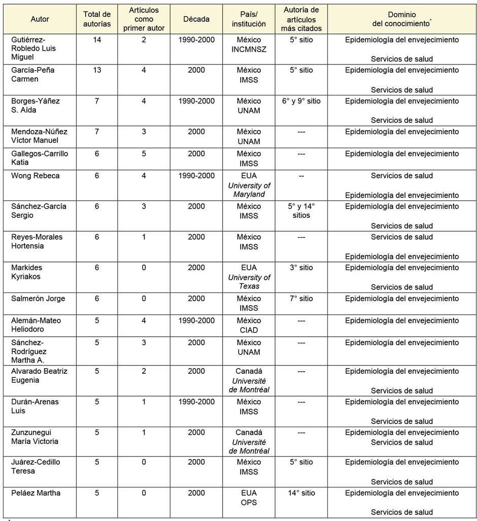 Dos grupos de autores forman parte de esta comunidad científica. El primer grupo es el formado por 413 autores con una autoría transitoria, es decir, autores quienes aparecen en una sola década en uno o dos artículos y después ya no publicaron más en este campo. Entre ellos se encuentran todos los autores de los artículos precursores, 71.6% de los autores de la década de 1990 y 91.8% de los autores de la década de 2000. En este sentido, este primer grupo de autores contribuyó poco al desarrollo del campo al tener no solo una presencia efímera sino también una baja producción. El segundo es un grupo pequeño de 52 autores con una mayor producción y permanencia en el campo, por lo cual se infiere un mayor interés por el mismo. Sus prácticas de publicación definen dos tipos de autorías. La primera es la autoría reciente de 31 autores, quienes, con una mayor productividad, entre tres y 13 artículos, se integraron al campo durante la década de 2000. La otra es la autoría continua de 21 autores, cuya productividad por arriba de tres artículos inició en la década de 1990 y permaneció durante la década de 2000 (cuadro IV). Un subgrupo destaca al interior de esta pequeña comunidad de 52 autores: los autores prolíficos, quienes publicaron más de cinco artículos. Varias características distinguen a estos 17 autores prolíficos (cuadro V). Aunque 12 de ellos eran de México, la presencia de tres autores de Estados Unidos y dos de Canadá merece ser destacada por su alta productividad y por impulsar este campo desde fuera de México. Segundo, la mayoría de los autores prolíficos tenían una autoría de tipo reciente, es decir, una alta productividad tan solo en la década de 2000. Tercero, los autores prolíficos han impulsado este campo tanto desde instituciones académicas, específicamente universidades nacionales y extranjeras, como desde los servicios de salud, particularmente desde el Instituto Mexicano del Seguro Social (IMSS). Cuarto, su influencia intelectual en el campo es destacable, ya que poco más de la mitad cuenta entre su autoría con uno o dos de los artículos con mayor número de citaciones. Quinto, estos autores impulsaron el campo en su conjunto al publicar tanto estudios sobre la epidemiología del envejecimiento como sobre los servicios de salud y 12 de ellos publicaron en ambos dominios. Finalmente, destacan cinco autores al desempeñarse como líderes en el campo en virtud de una mayor autoría como primer autor, de los cuales cuatro de ellas son mujeres: Aída Borges-Yáñez, Katia Gallegos-Carrillo, Rebeca Wong, Martha Sánchez-Rodríguez, además de Heliodoro Alemán-Mateo; el resto actuaron como autores puente al publicar más en coautoría con autores de distintas instituciones e impulsando la cooperación nacional e internacional (cuadro V).