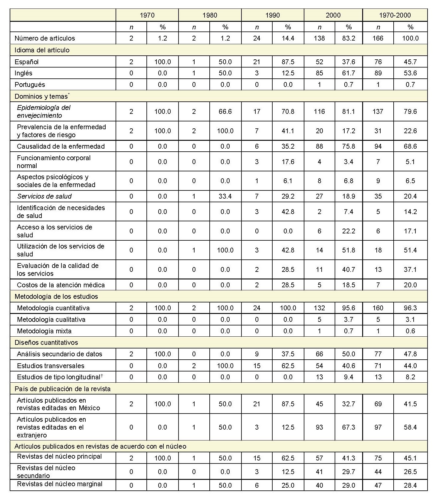 En la etapa precursora, los primeros cuatro artículos de las décadas de 1970 y 1980 se circunscribían a la descripción de la morbilidad y la mortalidad a partir de los censos, y solo uno incluyó datos sobre la utilización de los servicios de salud. La década de 1990 fue una etapa de transiciones. En el dominio de la epidemiología del envejecimiento, aunque la prevalencia de la enfermedad y los factores de riesgo continúan siendo la mayor producción (41.1%), se agregan dos temas. Uno, los primeros estudios sobre la causalidad de la enfermedad (35.2%) y, el otro, los primeros estudios sobre el funcionamiento corporal en adultos mayores sanos. Respecto a los estudios sobre los servicios de salud, por una parte, aumenta el número de artículos, que representa un tercio de la producción, y, por otra, se centra en identificar las necesidades de salud como un indicador de la demanda potencial de servicios de salud, así como en el tema de la utilización de los servicios de salud. En cuanto a la metodología, aunque predominaron los diseños transversales (62.5%), poco más de un tercio fueron estudios con análisis secundarios de datos, los cuales ya no se basaron en los datos de los censos como en las dos décadas previas, sino en las encuestas nacionales, ya sea de salud o de enfermedades crónicas o de adicciones disponibles en ese tiempo; cabe señalar que estas encuestas no son específicas sobre vejez, pero las muestras incluyen a adultos mayores de 65 años (cuadro I).
