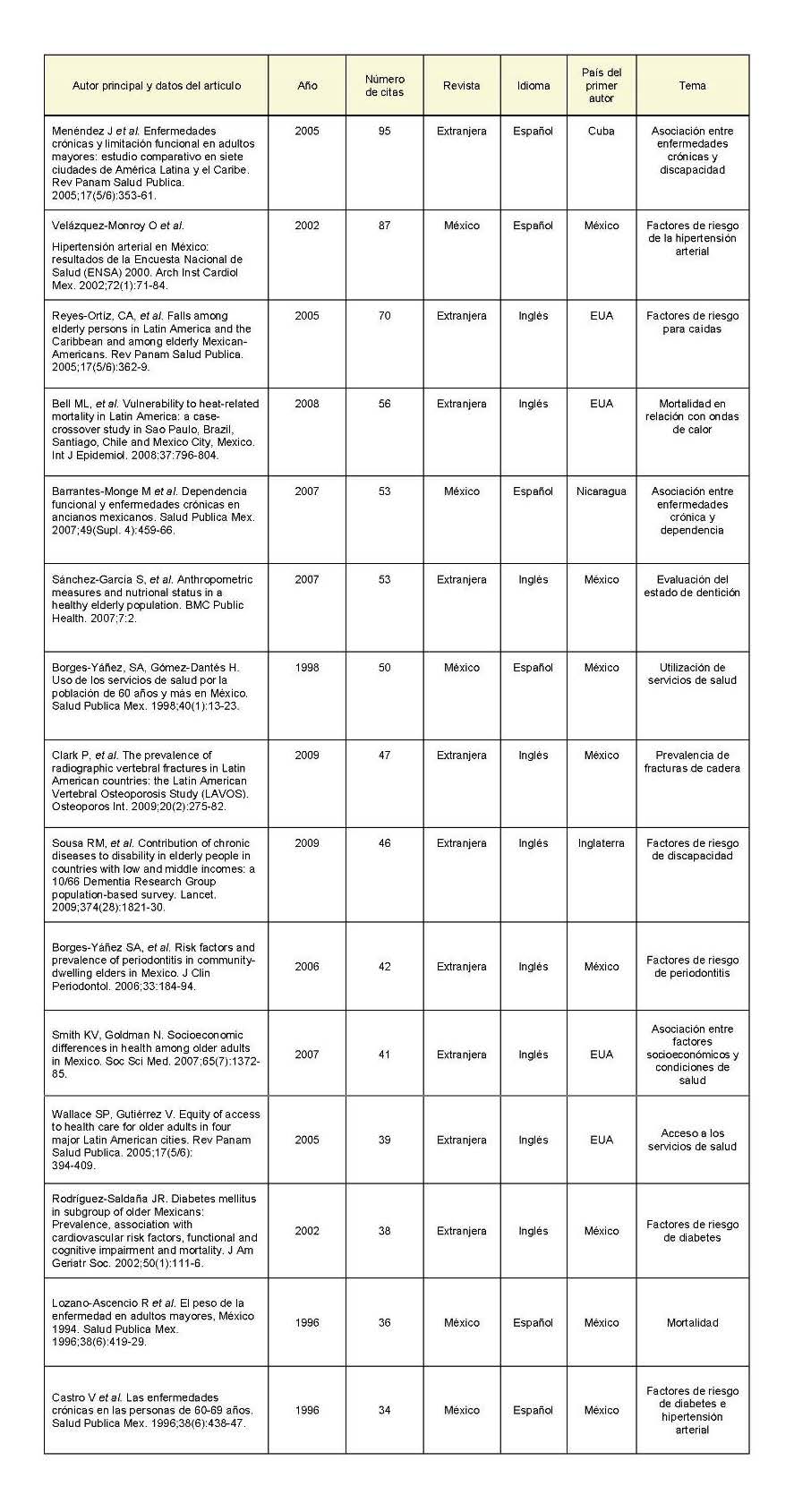 De toda la producción del periodo, 17 artículos fueron los más citados y acumularon 855 citas, es decir, un tercio del total de las citaciones, por lo que son las publicaciones con mayor influencia intelectual en el campo. Estos 17 artículos se caracterizan por ser una producción de tipo internacional, ya que 12 artículos fueron publicados en revistas editadas en el extranjero, 11 en idioma inglés y el primer autor de 10 de los artículos era de un país extranjero, principalmente de Estados Unidos. En cambio, los autores de México encabezan la producción nacional con más citaciones, la mayoría publicados en español y básicamente en la revista Salud Pública de México. Catorce de los artículos con más citaciones corresponden a la década de 2000 y obtuvieron un rápido reconocimiento, ya que ocho de ellos recibieron citaciones en un lapso menor a cinco años posteriores a su publicación y ocuparon las primeras posiciones por el número de citas. La mayoría de esta producción con mayor número de citaciones fueron estudios de tipo analítico sobre factores de riesgo y condiciones de salud (cuadro III).