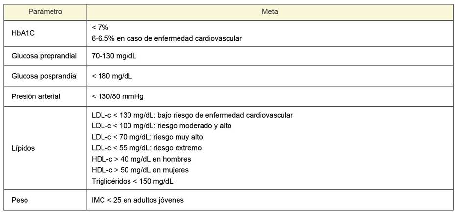 La ADA7 recomienda la supervisión de los HC, ya sea por conteo o intercambios como estrategias para lograr el control glucémico. Recomienda dietas con un aporte < 55% de HC e incluso ha sugerido un consumo mínimo de 130 g/día. No solo la cantidad de los HC, sino también la forma física, los métodos de procesamiento y la cocción del alimento influyen en la glucemia. El uso del IG y de la carga glucémica (CG) proporcionan un beneficio adicional, en conjunto con un consumo de fibra de 14 g/1000 kcal. Los edulcorantes no nutritivos son seguros cuando se consumen dentro de los niveles de ingesta diaria establecidos por la Food and Drug Administration (FDA). La ingesta de proteína debe ser individualizada; el aporte sugerido es el habitual entre 15 y 20%. Si bien un aporte > 20% de las calorías totales puede contribuir a un aumento en la saciedad, no se ha establecido su efecto a largo plazo sobre la función renal. En relación con las grasas, es más importante el tipo de grasas que se consume que la cantidad.