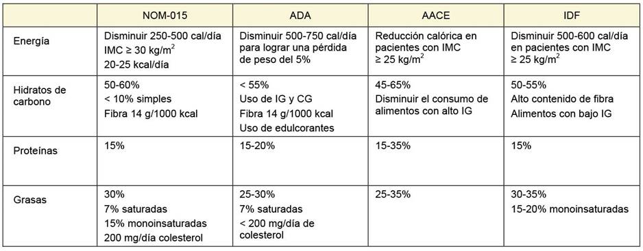 La AACE4,5recomienda limitar el consumo de azúcar y de alimentos con alto índice glucémico (IG), así como ajustar las dosis de insulina de acuerdo con el consumo de HC. El plan de alimentación debe proporcionar entre el 45 y el 65% de la energía ingerida en forma de HC y por lo menos la mitad deben ser altos en fibra y evitar el consumo de alimentos con alto IG. Las frutas y verduras deben consumirse crudas para aumentar el consumo de fibra y fitonutrientes. En cuanto al consumo de proteínas, se recomienda que sea de 15 a 35% del total de la ingesta calórica, tanto de origen animal como vegetal y pueden reemplazar una porción de grasa saturada o HC refinados para ayudar a mejorar los lípidos en sangre y la presión arterial. La recomendación de lípidos va del 25 al 35% de la ingesta calórica total, la mayoría de grasas no saturadas a partir de aceites vegetales, semillas, nueces y pescado (incluyendo ácidos grasos omega-3).