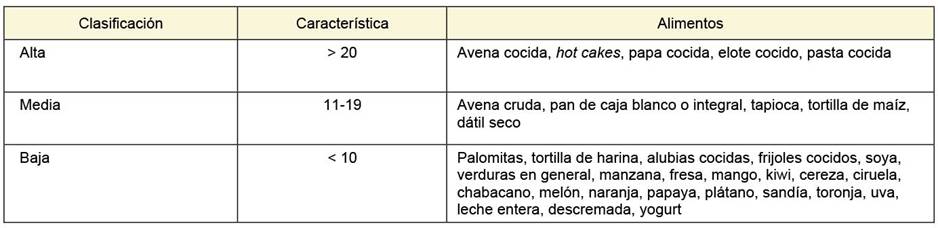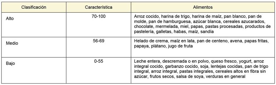 En 1981 David Jenkins definió el índice glucémico (como ya señalamos: IG) tomando en consideración la totalidad de la curva glucémica generada por un alimento estudiado y decidió asignarle a la glucosa un valor de 100. Así, el IG mide en qué grado los alimentos que contienen HC elevan la glucosa en la sangre.7 Para calcular el IG de un alimento se necesitan de 8 a 10 voluntarios sanos a quienes se les pide consumir de 25 a 50 gramos del alimento que se va a evaluar. Posteriormente se realizan mediciones de glucosa sérica cada 15 minutos durante la primera hora y posteriormente cada 30 minutos durante la segunda y tercera hora. Estas mediciones son comparadas con la respuesta obtenida de la glucosa o pan blanco y la mediana del resultado de todos los participantes será el IG al cual se le otorgará un puntaje entre el 0 y el 100.7 Los alimentos de bajo IG confieren beneficios a las personas con DM debido a que tienen una menor respuesta en la elevación de la glucosa sérica.9 En el cuadro III se muestra la clasificación de los alimentos según su IG. El IG de los alimentos se modifica por diversos factores durante su consumo o preparación, entre los que destacan: 9